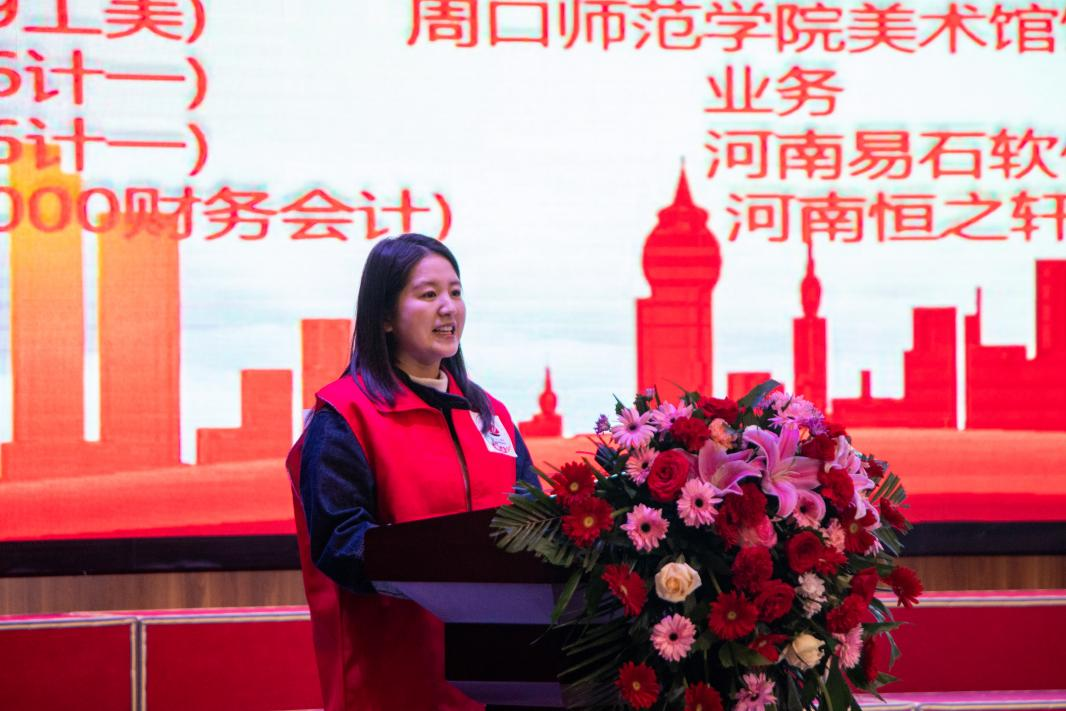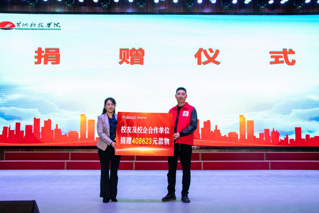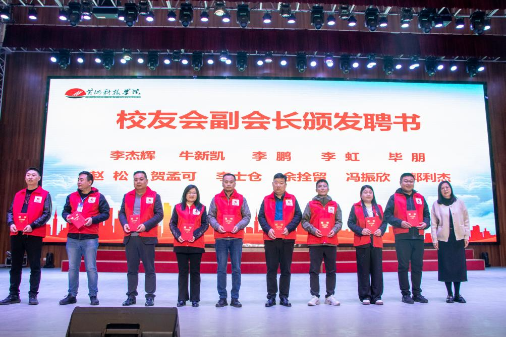 王威为校友会副会长代表颁发聘书,张光辉为副秘书长代表颁发聘书。随后,李杰辉代表校友们向学院捐赠了绘本、体智能服装、舞台灯光设备等物品,表达了对母校的感恩之情,李萍代表校友会接受校友捐赠物品。1997级电子专业李杰辉作为第一届校友会副会长代表发言,他说吃水不忘挖井人,树高万丈不忘根。校友们在这里成长,在这里奉献。今天许多校友代表欢聚一堂,在母校建校40周年校庆日子里,共同见证职业技术学院校友会成立。校友们用自己的行动感恩母校,回馈母校。学校校庆活动将在五月份迎来高潮,职业技术学院校友会将在学校校友总会的指导下,开展各式各样的活动,庆祝母校建校40周年。2019级学前教育专业王亚琼作为校友代表发言,她说感谢母校为校友们提供了成长的土壤,是母校的教育塑造了校友们今天。她难忘在2020年成为学院项目化学习受益的第一批学生,在学院的栽培下进入河南省实验幼儿园实习,并在2021年毕业季顺利通过省实验幼儿园考核成为一名幼儿教师。她代表年轻一代校友,感谢母校、感谢所有为搭建校友会而付出的领导老师,校友前辈们。她相信有大家的共同努力,“开拓、拼搏、实干、奉献”的黄科大精神会在这片美丽富饶的土地上闪闪发光,经久不息。来自海内外的优秀校友代表纷纷发来祝贺视频。