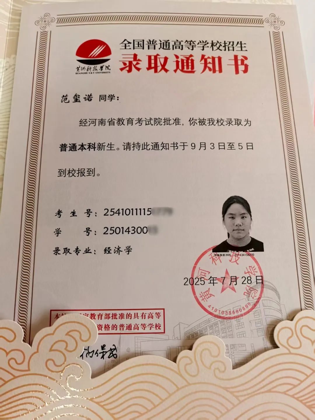 “能成为黄科大学子,延续您与母校的情缘,我倍感荣幸。”面对父亲的嘱托,范玺诺深受鼓舞。她表示,黄科大不仅是父亲青春的见证地,更是自己追寻梦想的起点。未来四年,她将以赤诚之心钻研专业知识,以真诚之态与人相处,在探索中找到热爱的方向,在坚持中沉淀自我,更会在独立生活中学会担当,“定当珍惜时光,不负母校之名,不负父亲的榜样力量与期待”。