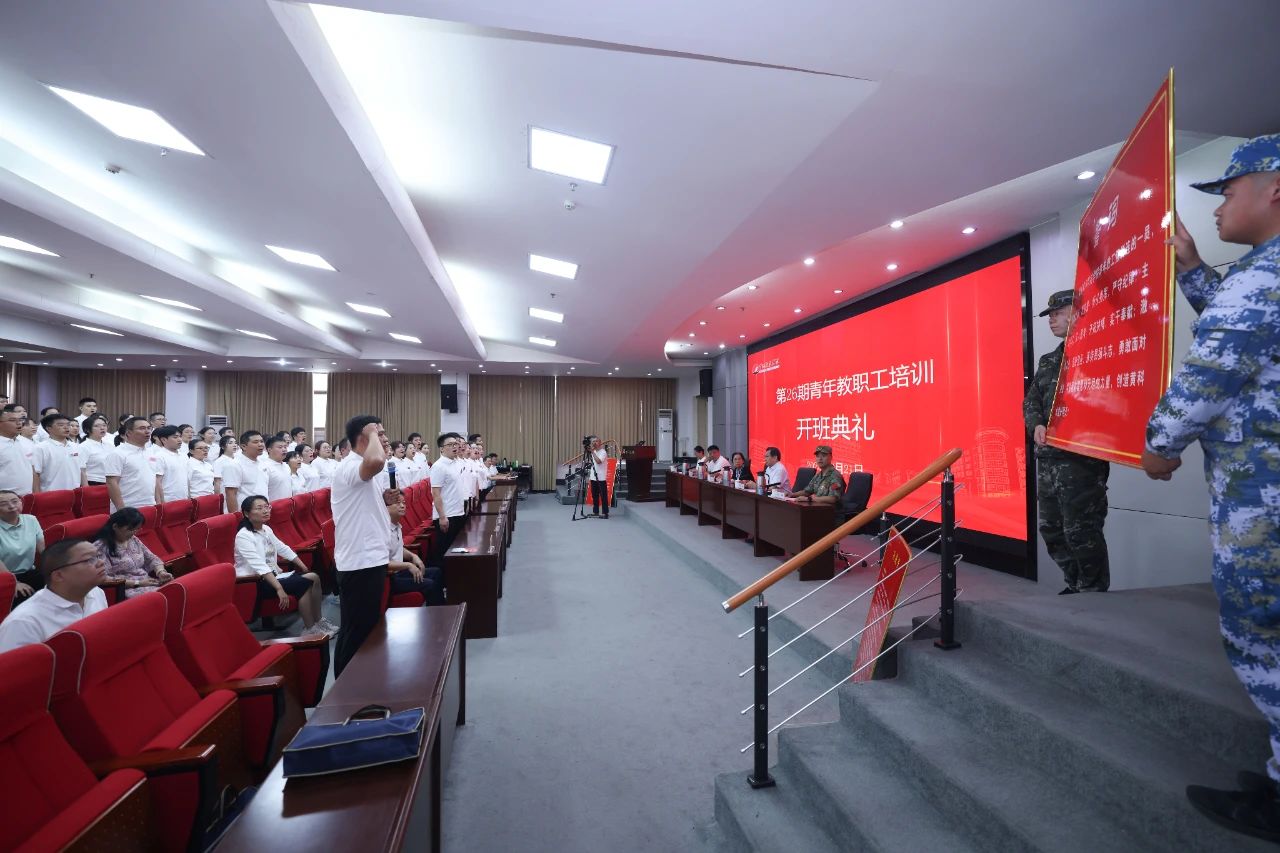 8月21日,我校第26期青年教职工强训连在信息大楼第一报告厅内隆重开班。校领导胡大白、孔留安,教师中心常务副主任、本期青教工强训连副总指挥李国柱,保卫处副处长、本期青教工强训连连长冯峰等出席开幕式。开幕式由学校纪委副书记、教师工作部部长、强训连临时党支部书记杨莉主持。强训连全体学员、各排排长和班导师等相关人员参加。