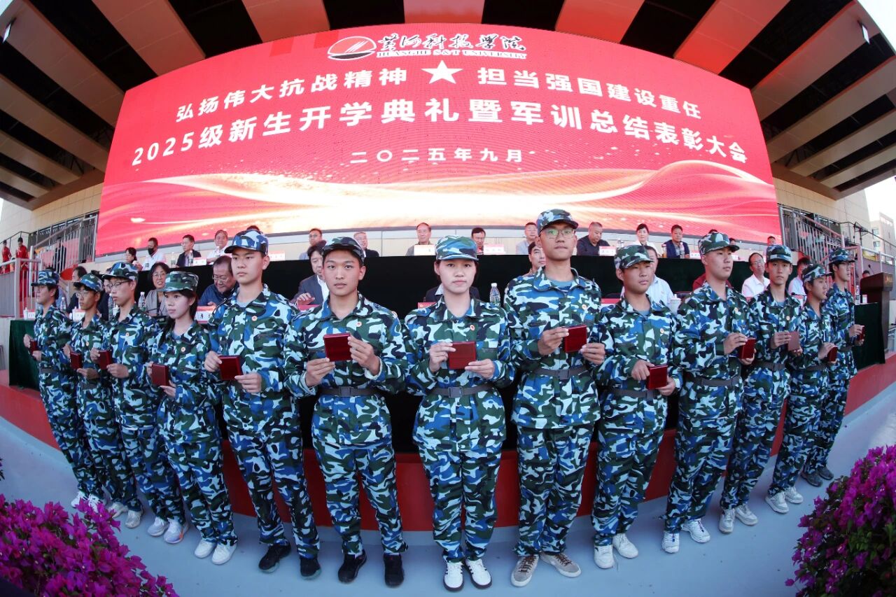 会上,党委副书记赵会利宣读了2025 级新生首批党校学员名单,副校长罗煜宣读了军训与入学教育工作先进集体和个人表彰决定。随后,与会领导为军训与入学教育先进单位、优秀工作者、优秀教官、优秀学员,以及军事技能课目示范奖获奖代表颁奖。值得关注的是,11 位“薪传奖”获得者登台领奖,他们分别来自工学部、艺体学部、商学部、医学部及国际学院,其父辈曾在黄科大求学,这份跨越时光的信任,让“开拓、拼搏、实干、奉献”的黄科大精神在他们身上得以传承。